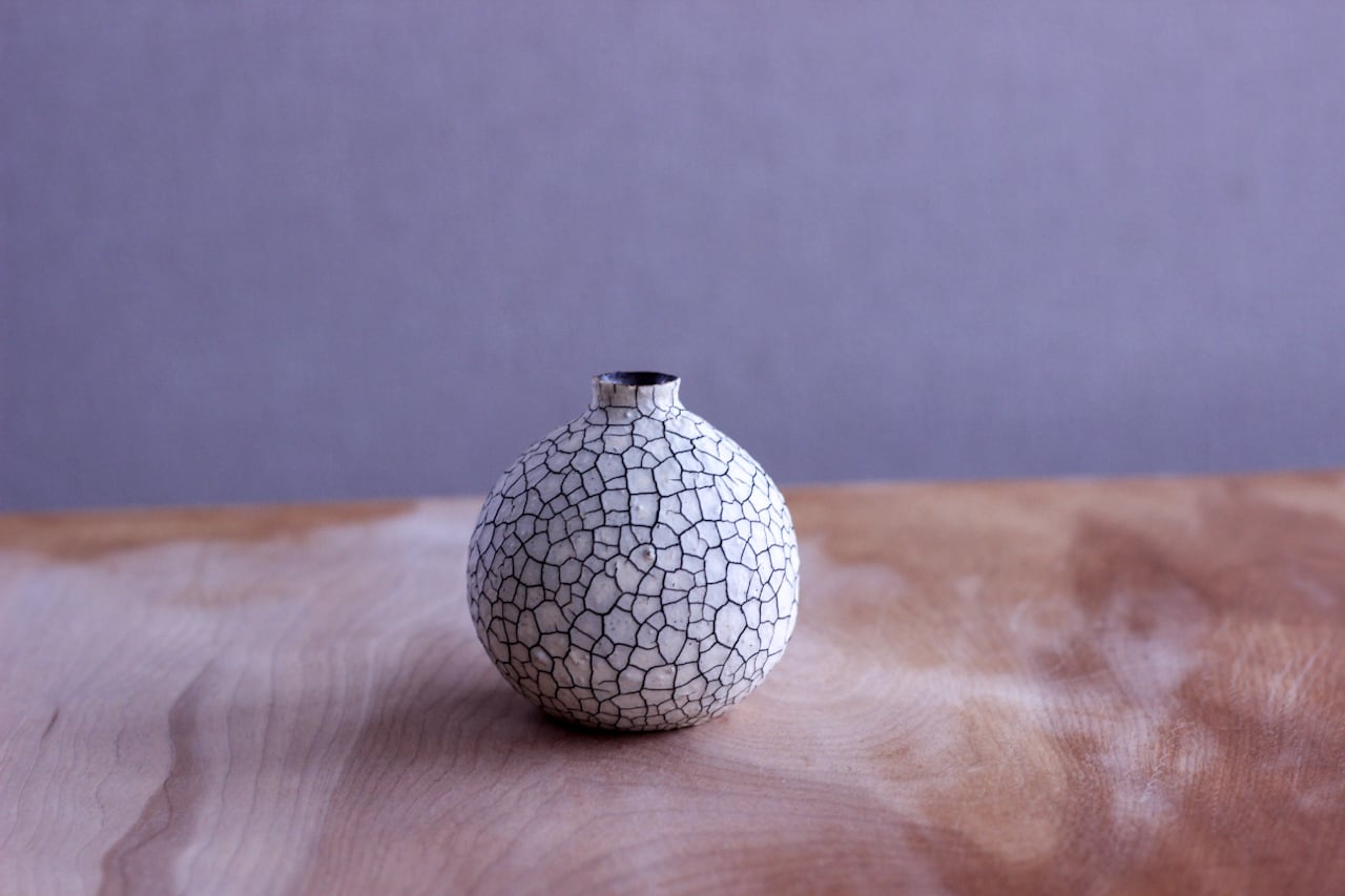 手にした瞬間、心が和むような、とっくり型の花器。つやのない白地に施された独特なヒビ模様が、シンプルでありながらも個性的な印象を与える一輪挿しです。どんな場所にも自然に調和し、お部屋を優雅に彩ってくれます。 手作りならではの表面の凹凸と微細なヒビ模様は、一つ一つが異なる美しさを持ち、見る人を魅了します。お気に入りの花を一輪だけ飾るだけでなく、インテリアアイテムとしても存在感を発揮します。特別な日の贈り物にもぴったりな魅力的な商品です。 大切な方への心温まる贈り物や、自分自身のためのインテリアアイテムとして、ぜひお選びください。 サイズ 約 径8㎝、高さ9㎝