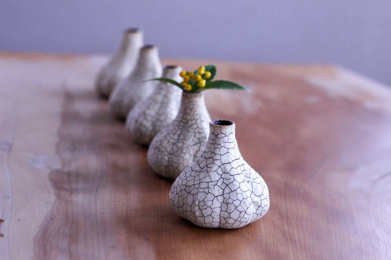 自然の風合いが漂う、にんにく型花器。白地(ツヤなし)にヒビ模様が入った、小さな一輪挿しです。存在感があるのに場所を取らないサイズ感が魅力。これひとつでお部屋に季節感を演出してくれます。 この花器は、一つずつ丁寧に手作りしています。お気に入りの一輪を飾って、季節感を楽しんだり、お部屋のアクセントに使ってみてはいかがでしょうか。 「にんにく型」というシャープでユニークな形状も、おしゃれに感度が高い方に大人気です。心地よい落ち着きがあるので、お部屋の雰囲気をカジュアルにしたいときや、モノトーンのお部屋にもぴったりです。日常使いはもちろん、ギフトとしても喜ばれること間違いなしです。 ぜひ、このにんにく型花器で素敵なお部屋作りを楽しんでください。 サイズ 約 径8㎝、高さ8㎝