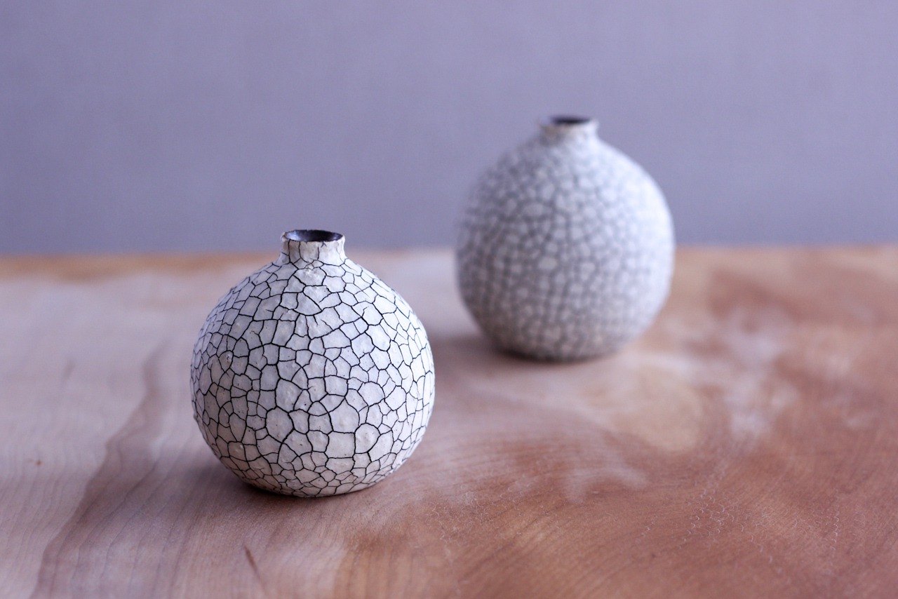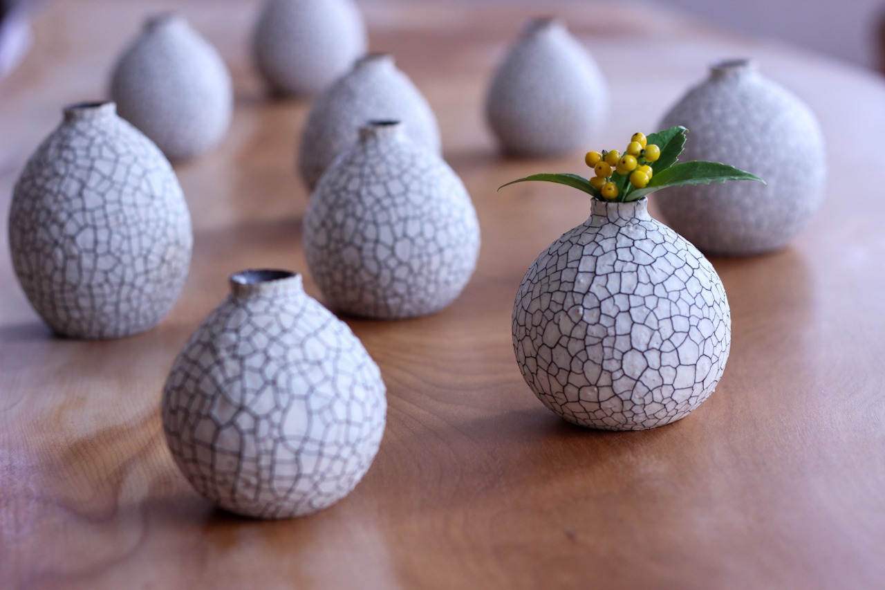 手にした瞬間、心が和むような、とっくり型の花器。つやのない白地に施された独特なヒビ模様が、シンプルでありながらも個性的な印象を与える一輪挿しです。どんな場所にも自然に調和し、お部屋を優雅に彩ってくれます。