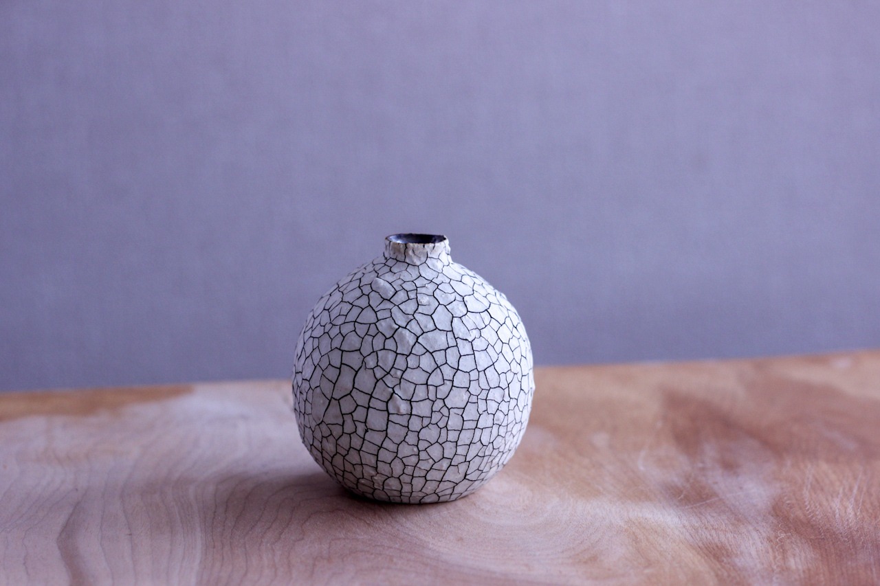 手にした瞬間、心が和むような、とっくり型の花器。つやのない白地に施された独特なヒビ模様が、シンプルでありながらも個性的な印象を与える一輪挿しです。どんな場所にも自然に調和し、お部屋を優雅に彩ってくれます。