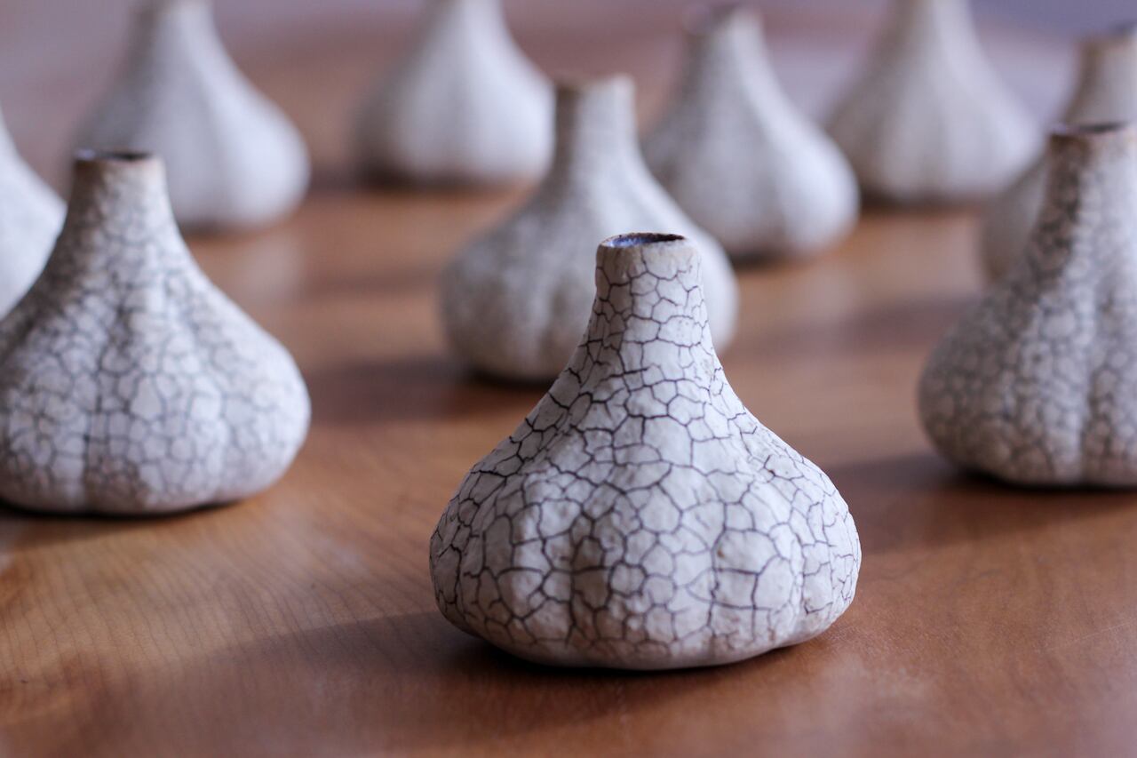 自然の風合いが漂う、にんにく型花器。白地(ツヤなし)にヒビ模様が入った、小さな一輪挿しです。存在感があるのに場所を取らないサイズ感が魅力。これひとつでお部屋に季節感を演出してくれます。