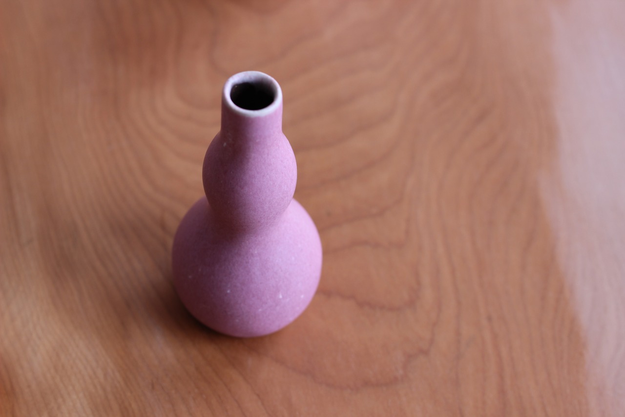 愛らしいひょうたん型花器です。ピンク色の釉薬がキュートで魅力的なアイテムです。