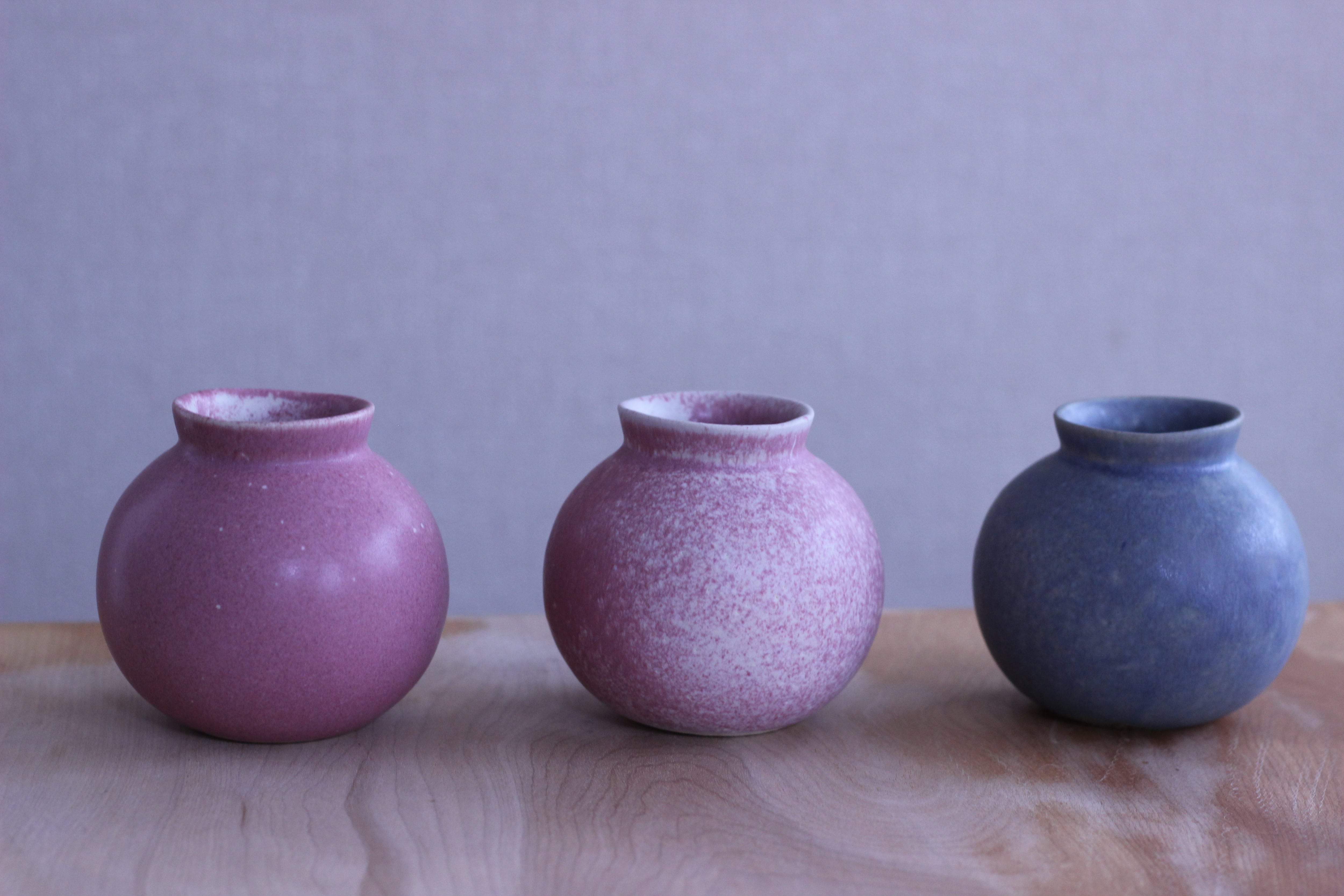 ブルー色の釉薬の結晶が印象的な丸い花器です。