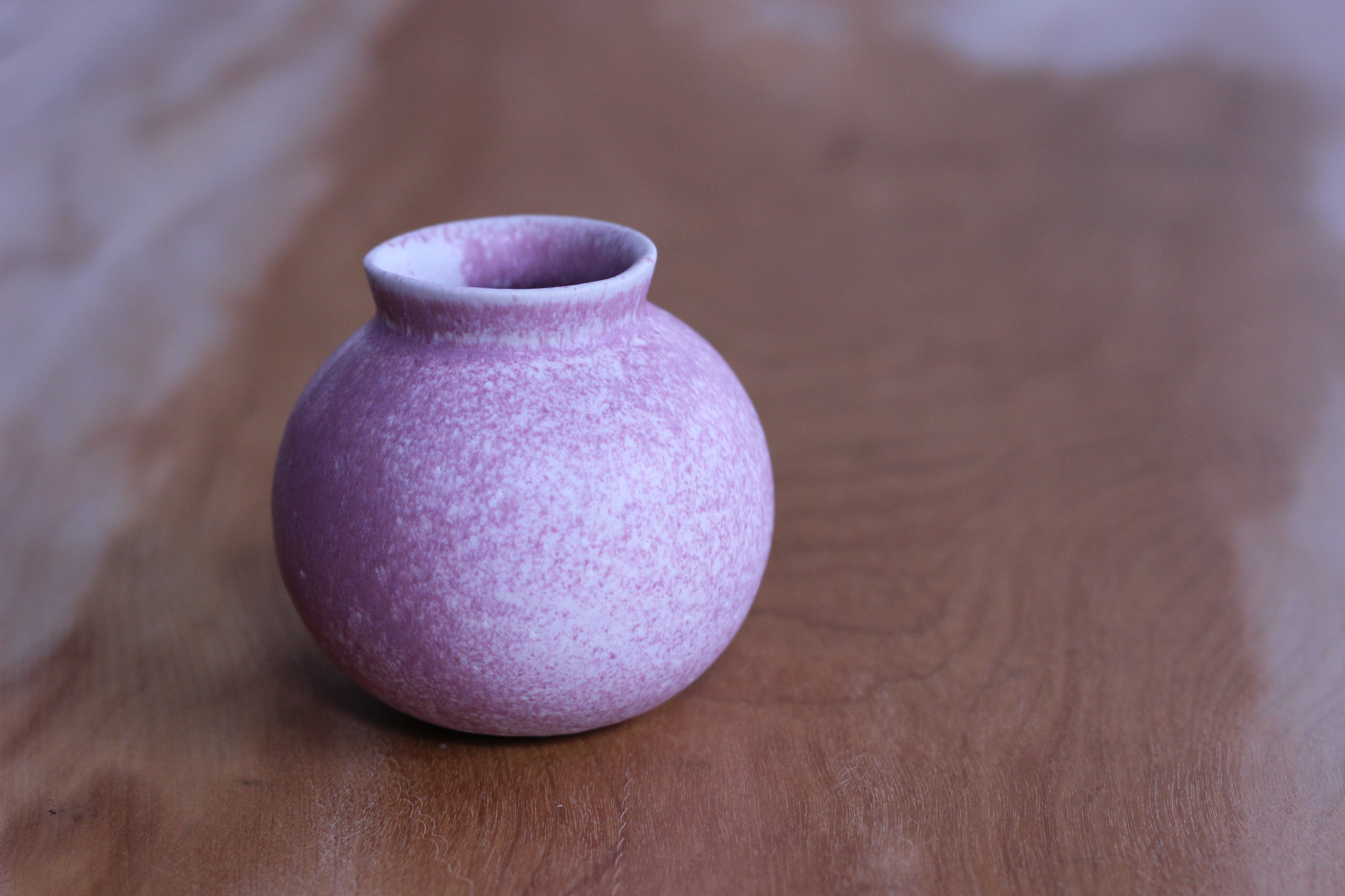 ピンク色の釉薬の濃淡が印象的な丸い花器です。